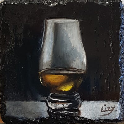 "Een glaasje whisky", olieverf op leisteen, 10x10 (Verkocht)